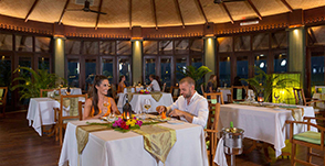 Ресторан, работающий по системе олл-инклюзив, и расположенный на деревянной террасе прямо над лагуной.